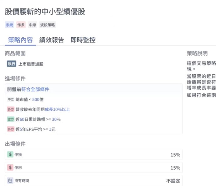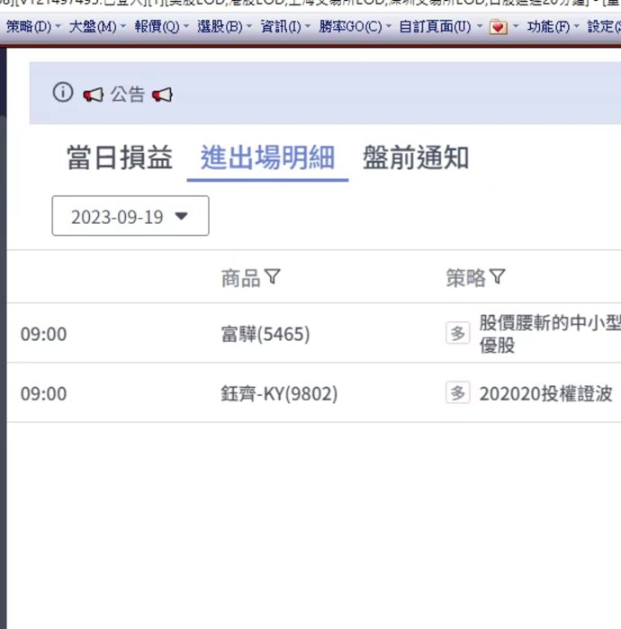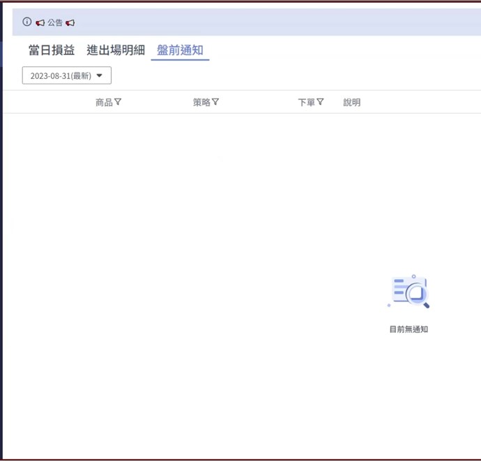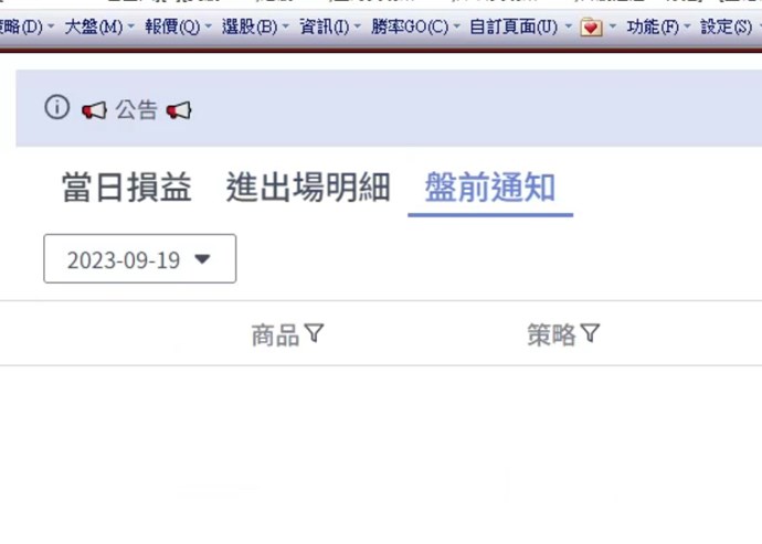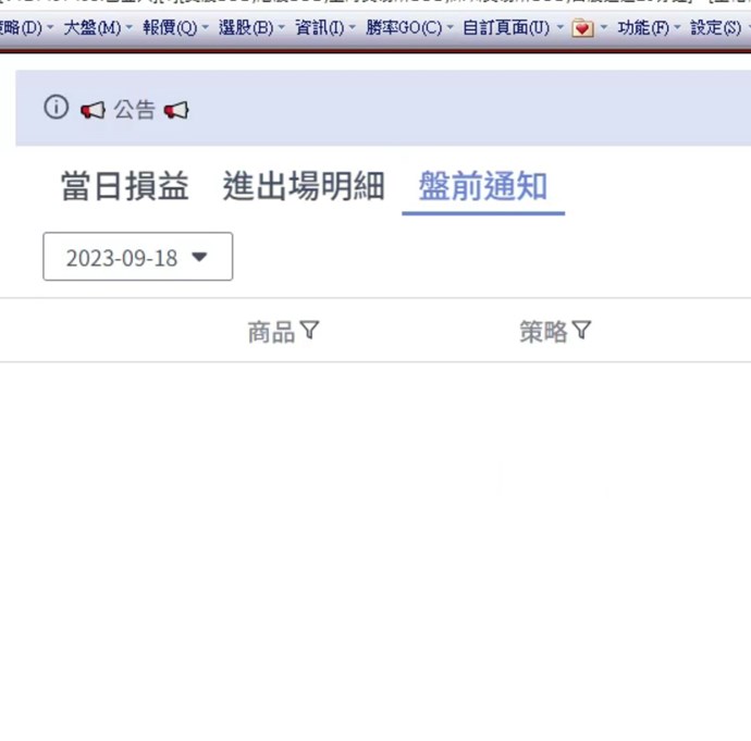 需注意要有盤前通知要是只使用 (前一日) 盤後的資料來作為進場出場條件,且啟動監控後的交易才會有盤前通知。