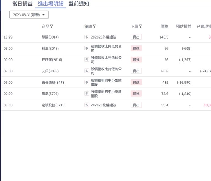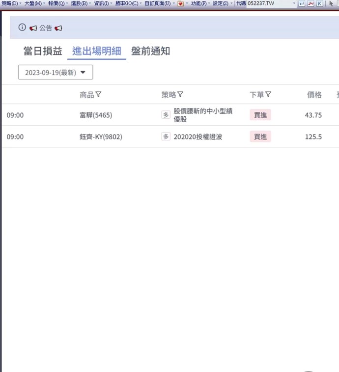 小編有請相關人員確認在伺服器的執行紀錄,您近幾天的交易紀錄都是出場,而停損停利出場是無法在盤前就事先知道的。
