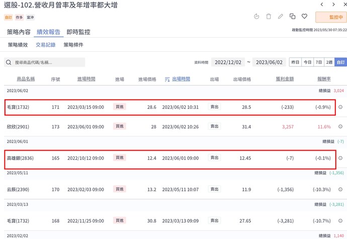 2. 6/2時因為公司網路設備有問題,導致開盤前沒同步到資料,才會在10點半左右同步到資料後做出場處理。