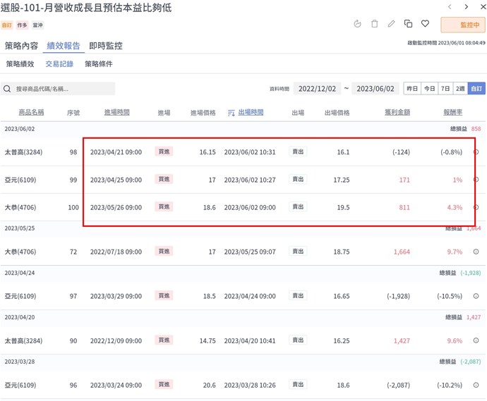 =>只會以最新一天的自動選股篩選出來的商品判斷過去的進出場。