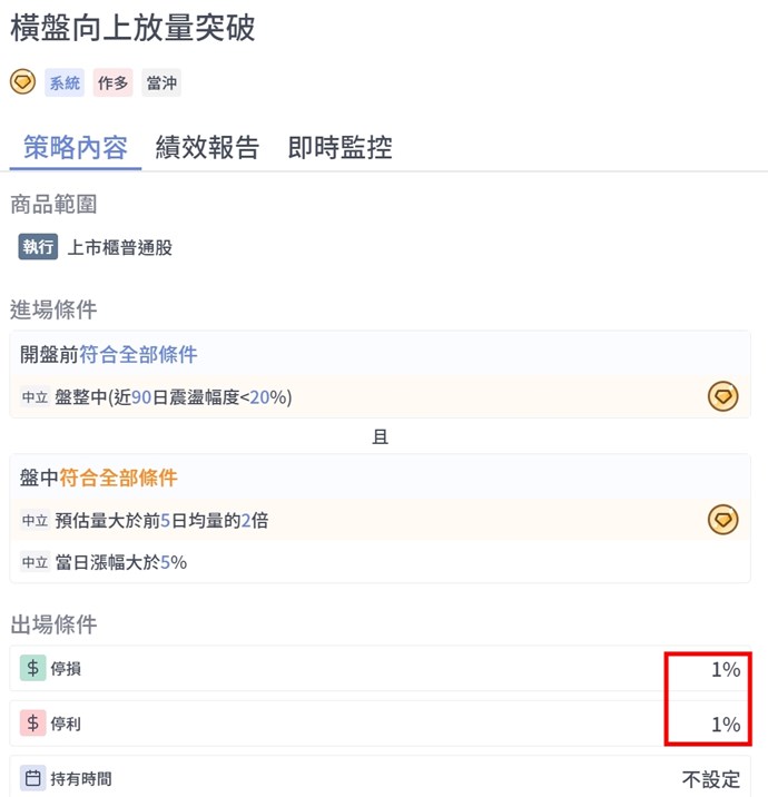 須注意若該商品是在區間外進場,區間內出場的話,則會以區間前一天的收盤價為進場價計算作判斷。