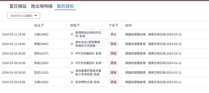 需注意策略本身要啟動監控後才會開始有盤前通知。