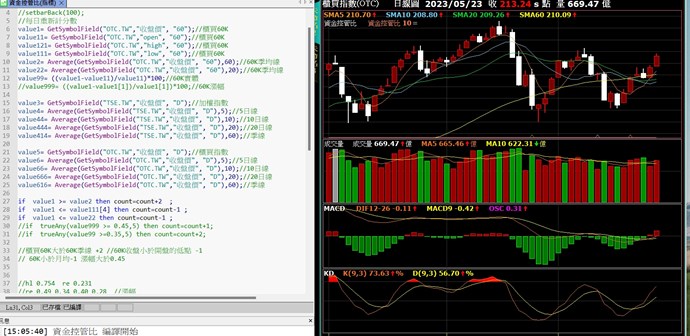 且由於您使用的是日頻率,每根日頻率有5跟60分鐘Bar,故因時間對位邏輯,每次日頻率運算的 getfield("Close", "60") 會是當日最後一根Bar的收盤價。