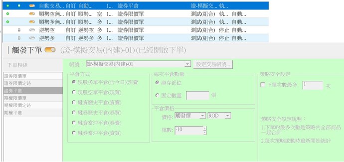 出場雷達的下單設定,記得選"證卷平倉",平倉數量選"庫存部位",這樣跑起來就會順利很多