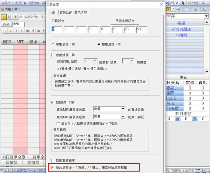 您好,請協助確認閃電下單的功能設定視窗,是否有設定「委託成交後,「買進」/「賣出」欄位保留成交數量」,可以取消勾選試看看。
