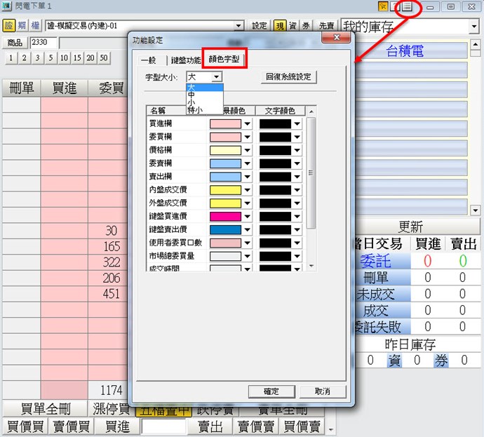 您好,可以使用"閃電下單"功能右上方的「功能設定→顏色字型」,字型可以選擇-特小/小/中/大,閃電下單的界面大小會隨字型變更。目前無法自行調整寬度,相關需求將轉呈相關人員進行評估。