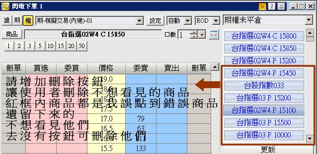 例如: 我的 未平倉只有 台指近 , 但閃電清單 卻還多顯示了 周選 15000Call