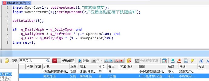 您好,我有從XS函數語法大概篩出我要的資料,想要尋找開高走低或是開低走高的個股,但因為是新手,沒有程式基礎,目前遇到不知道怎麼將這些語法串起來,懇請指導修正