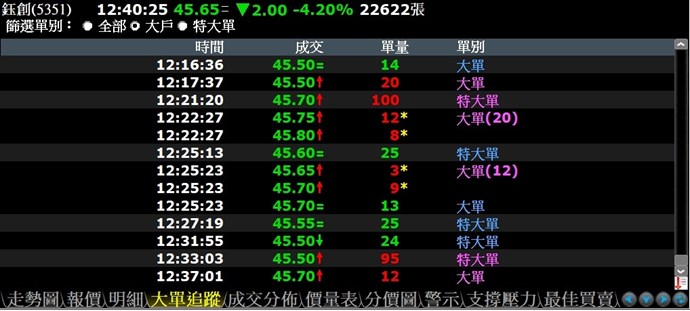 在大單追蹤頁籤, 在點選大戶或特大單時, 除了可以顯示明細外, 把目前的內盤合計, 外盤合計, 內外盤差額, 等3項的張數,
