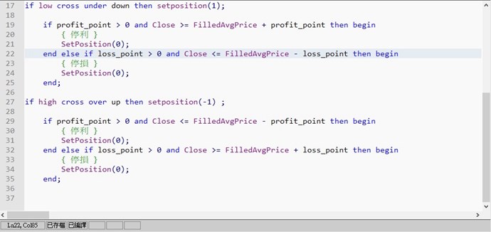 所以只要符合 close <= filledavgprice - loss_point、close <= filledavgprice - profit_point、close >= filledavgprice + loss_point、close >= filledavgprice + profit_point 任一就會出場。