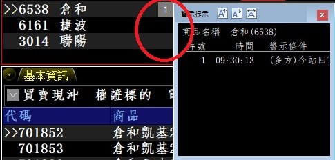XQ大大您好,有一個問題想問很久了,但一直忘記發問,想請問一下XQ大大,在主畫面的標的名稱旁邊的警示提示(黃圈處),點了都不顯示提示,只有在報價欄位的才會出現提示(紅圈處)。可以修正一下這個BUG,讓主畫面的也能夠正常顯示嗎? 謝謝