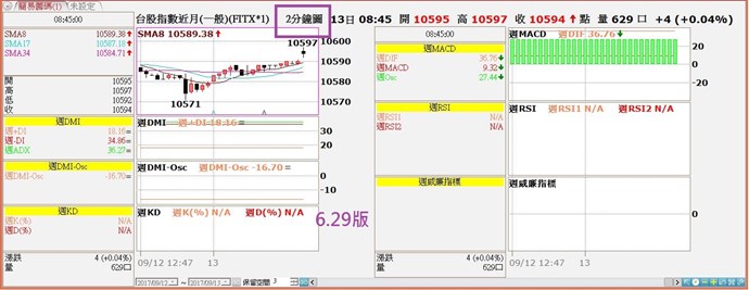 可以在2分鐘線圖顯示週DMI、週DMI-Osc、週KD、週MACD與週RSI,請您再試試看,謝謝。
