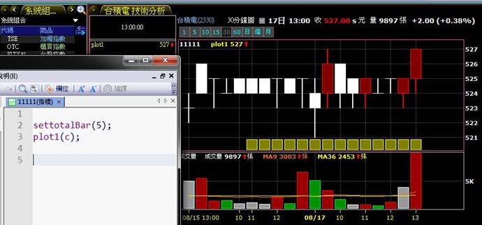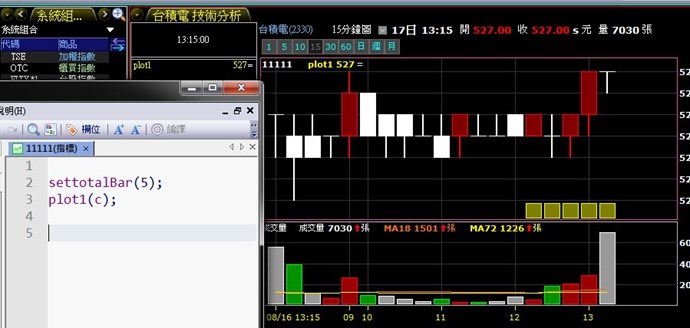 settotalBar是指目前頻率執行腳本的K棒數量,不過剛剛測試指標腳本,發現一些問題,例如settotalBar(5);在台積電30分頻率下竟然發生1日+5根K棒,而切換到15分頻率時,又正常顯示5根K棒。