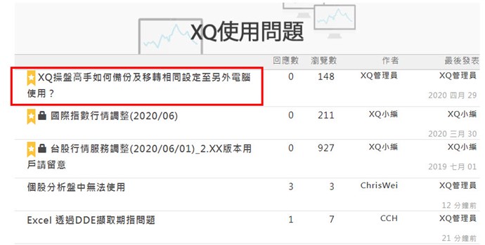 爬了官網的教學,大概就教頁面匯出做備份,但很顯然這不是我要的。爬文看了技術討論版上的十多篇各種備份相關問題,大概知道了下列方法: XQ程式安裝路徑「C:\SysJust\XQLite\」底下的「User」folder整個複製。請問,這個方法,就可以把原本A電腦裡面的XQ所有東西(前述的所有東西,自訂的指標/選股腳本/自訂頁面/排程/函數/腳本/畫面中的註解和畫線.....恩,就是一切的一切。)都還原到B電腦的XQ當中嗎? (當然前提是兩台電腦的XQ版本相同,這我能處理)