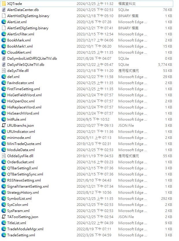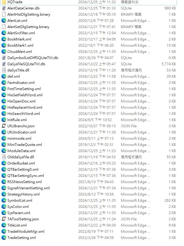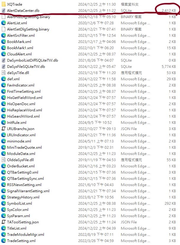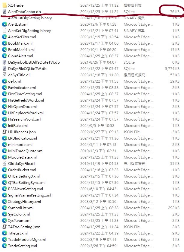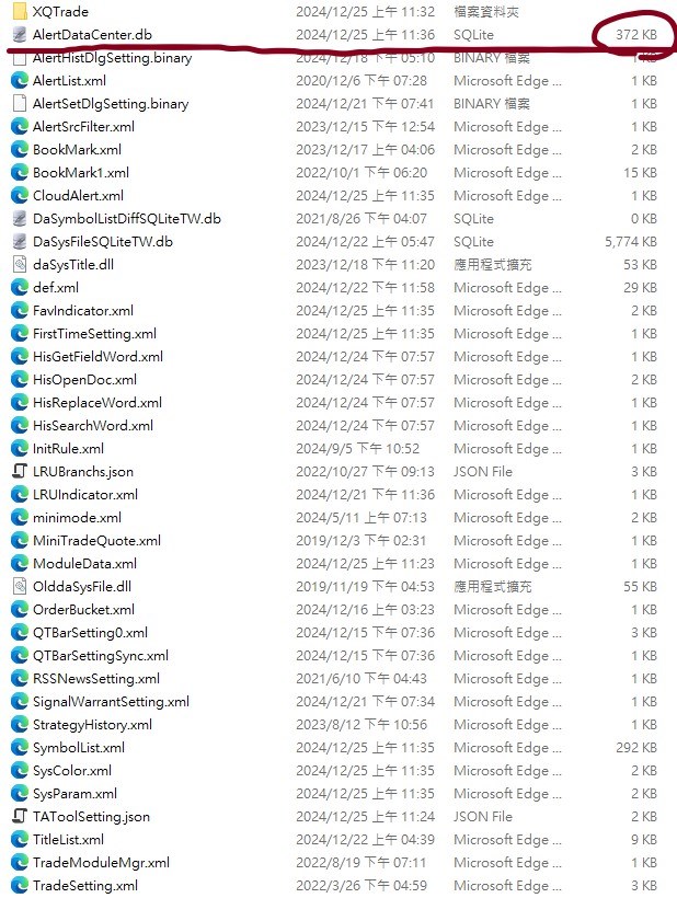 3.我有觀察C:\SysJust\XQLite\User\XQ登入帳號\Data\AlertDataCenter.db這個紀錄Alert的DB檔,盤中有到1M左右的容量大小,但關閉XQ程式再開始就變成88K左右的容量大小,資料量少了很多.