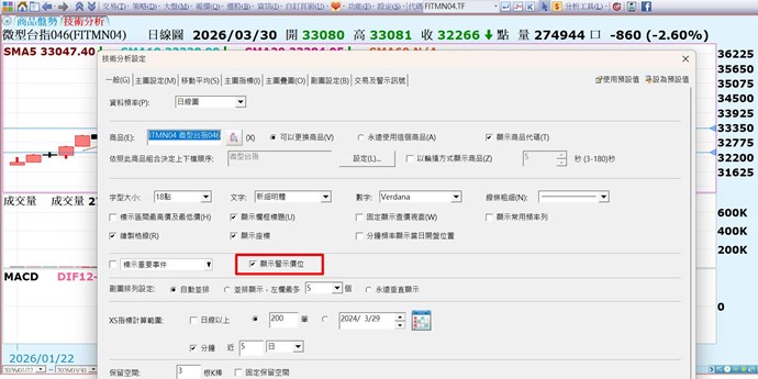 您好,煩請協助確認技術分析是否有勾選“顯示警示價位”。