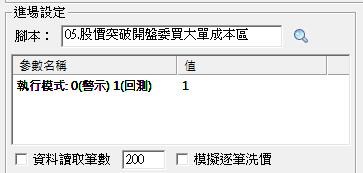 例如:股價突破開盤委買大單成本區,這個策略有使用到 q_BoughtLotsAtOpen 和 q_SoldLotsAtOpen 這兩個報價欄位資料,