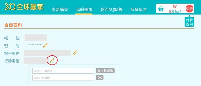 您好,更改手機號碼請至「設定/我的權限」,填寫新的手機號碼並重新驗證。