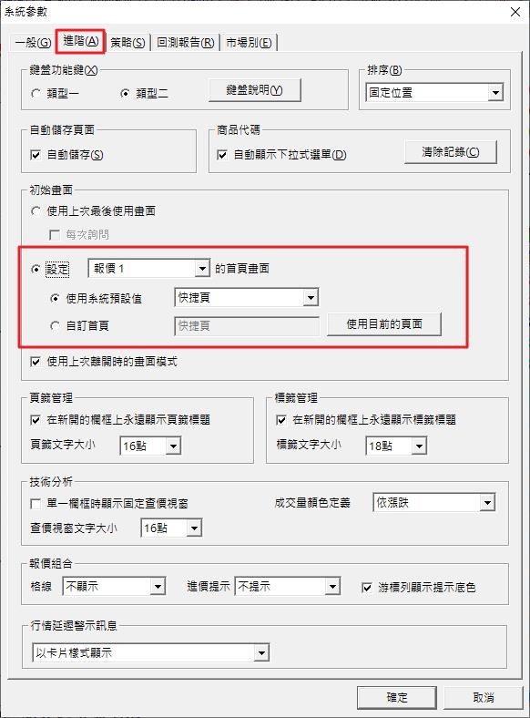 您好,在主選單的"設定"->"我的設定"->"系統偏好設定"->"進階"標籤,可以自行設定系統預設4個大頁籤的首頁畫面(按工具列上的小房子icon會回到該頁的首頁)。