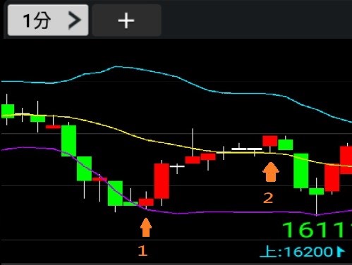 1.其中1根k棒最低價接觸布林下軌後上升且該k棒收盤價大於布林下軌