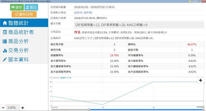 您好,關於此問題,小幫手猜想您應該是用內建的MACD黃金交叉當作進場,死亡交叉當作出場,並針對 FITXN07.TF 商品做回測,