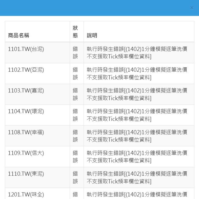 回測報告顯示你執行的商品有1864檔錯誤,請先點擊紅色字的1864(失敗),看看錯誤的訊息是什麼。