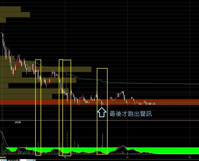 黃色框框處 是代表每次下殺已經帶量>前幾分的量,但卻沒有警訊)