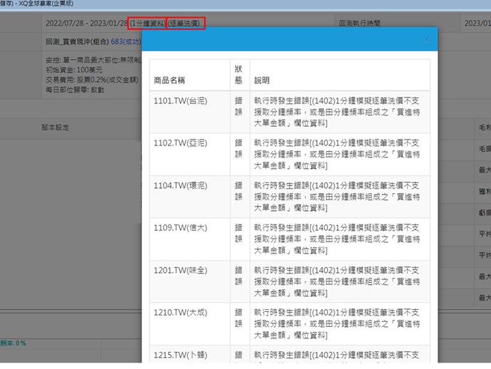 您1分鐘頻率的狀況下取消勾選逐筆洗價的話就可以回測,或是在其他頻率的狀況下使用逐筆洗價亦可。