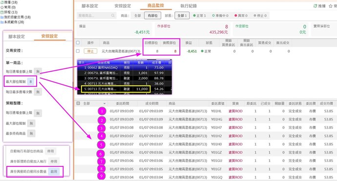 安控設定最大部位為8會讓策略最多只有8個部位,和實際庫存數量沒有關係。