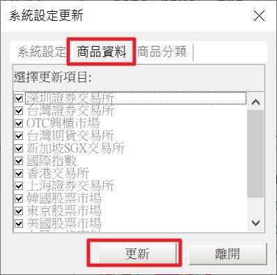 可以執行:功能 -> 設定 -> 系統設定更新 -> 點選視窗中商品資料或商品分類 -> 更新