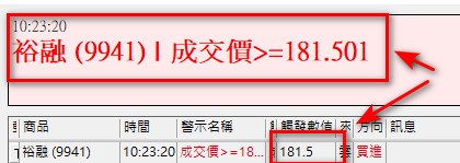 今日 9941 設定雲端監控 成交價>=181.501,但卻在181.50成交價就觸發警示了,請小幫手協助確認,謝謝