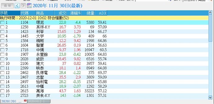 我想找出ADX超過55的股票,程式碼如下,11/30盤後有篩出1101台泥,其ADX為57.35,但在日線圖的DMI指標卻顯示ADX13值為39.99,可否幫我看一 下,是哪裡寫錯了?謝謝!