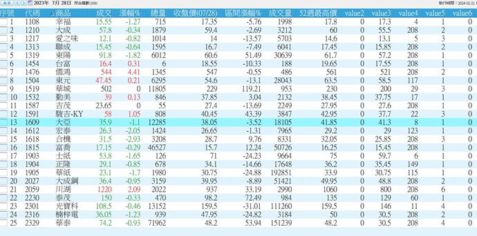#5: 1319東陽, 在2023/7/28時, value3(上一個52週最高價)是57.20(2022/9/16),
