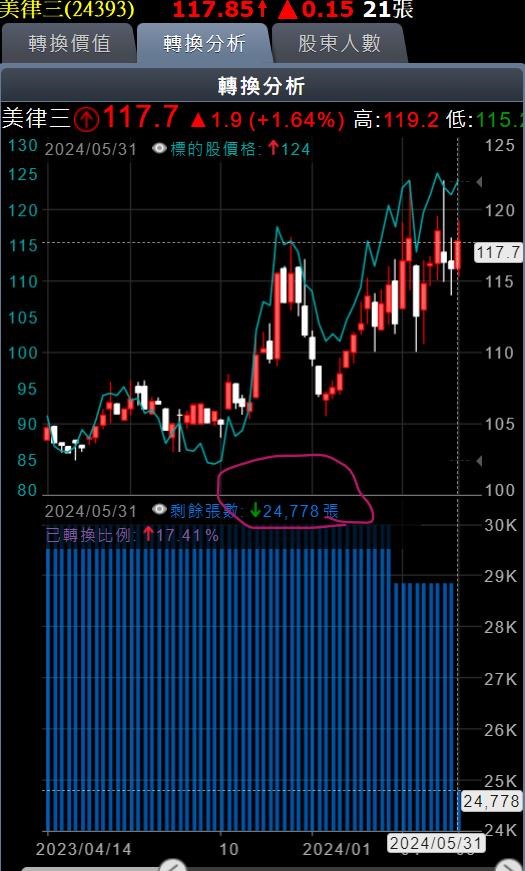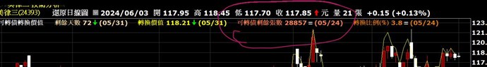 目前時間是6/3 9:49, 我用指標去抓CB剩餘張數, 以24393為例是28857張(這是上周的資料)
