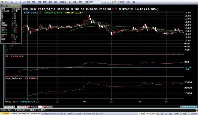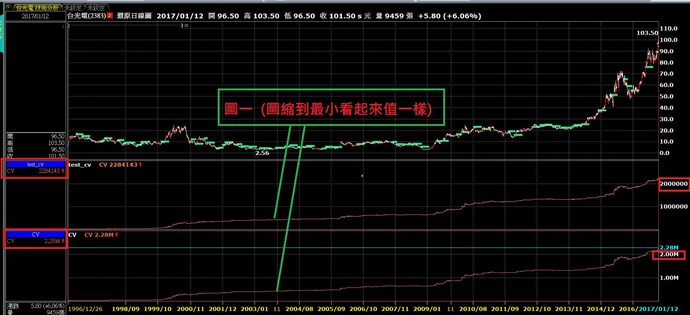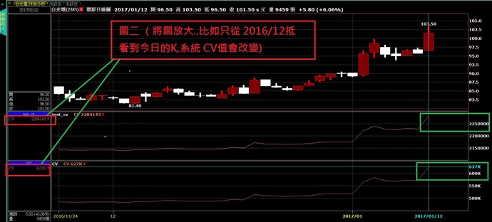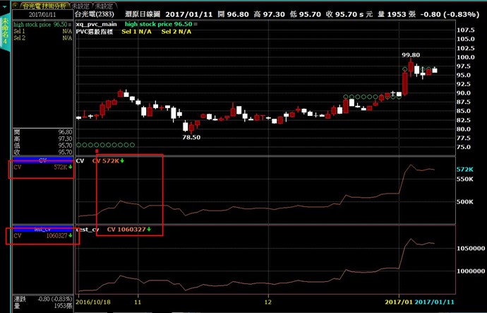 拿系統/XQ量能指標裡的 CV指標程式碼, 重新編譯, 執行結果跟內建的 "CV" 指標的值差異很大(如附圖). 想請問為何會如此?