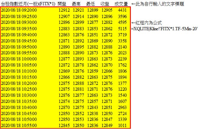 3、輸入(或貼上) =XQLITE|Kline!'FITX*1.TF-5Min-20',按下鍵盤:[Ctrl]+[Shift]+[Enter],稍待一會兒,資料即會出現。
