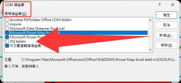 3. 選擇 「XQAddin」 > 點選右方「移除」按鈕