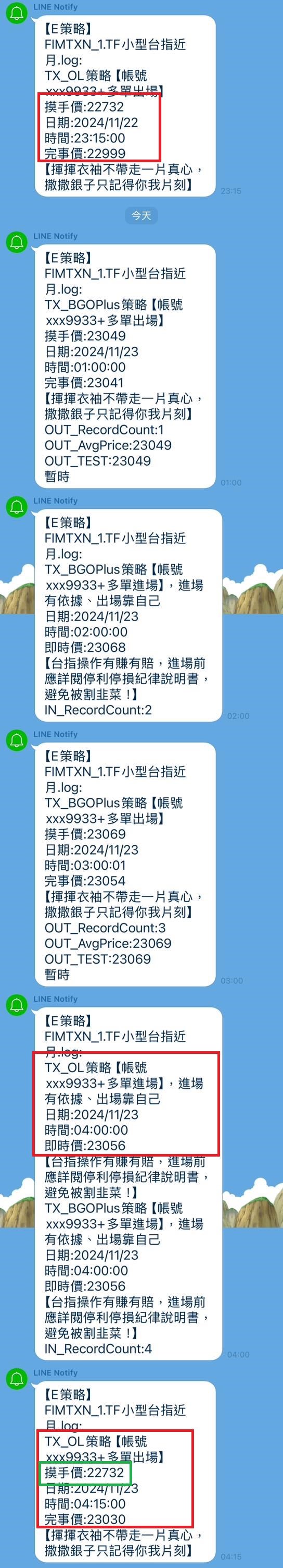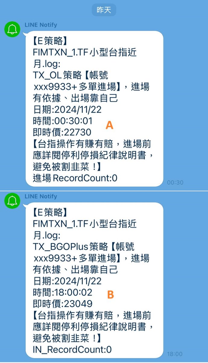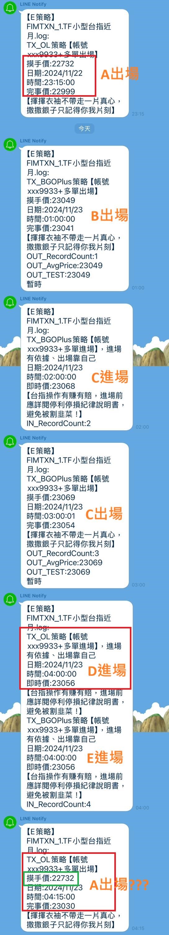 另外如下圖所示,因策略不同,所以應該會各別抓取進場成本,但在昨晚最後一筆E進場後,出場卻顯示A的點位,以往出現問題的時候都是凌晨時段,所以我才想說會不會是跨日問題造成.