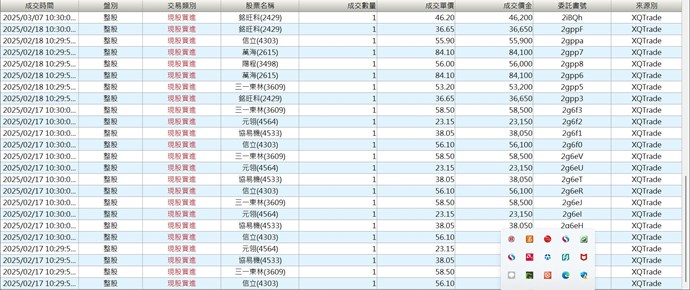 29:58.0 2gppa 整股 現股買進 IOC 信立(4303) 1 55.9 0 1 XQTrade 2025/2/18 完全成交