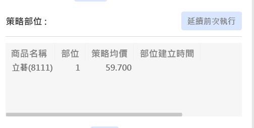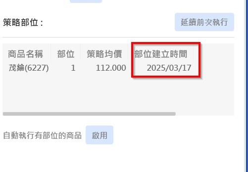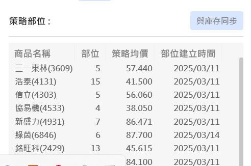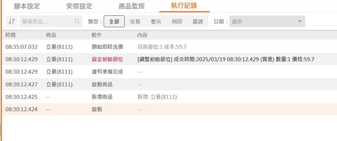 20250314 09:19:48.699 信立(4303) 設定初始部位 [調整初始部位] 成交時間:2025/03/11 00:00:00.000 (買進) 數量:5 價格:56.06