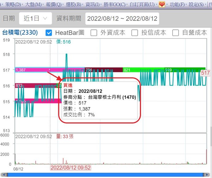 1.綠色代表賣,紅色代表買,粉紫色代表?