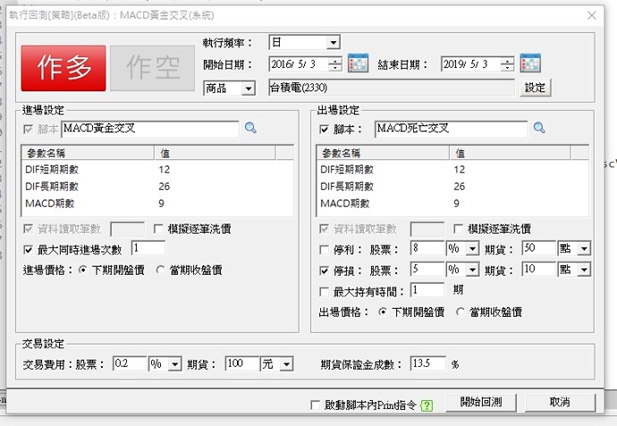 我用系統內建的 MACD黃金交叉當進場條件 MACD死亡交叉當出場條件