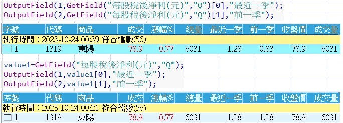 想請教我用以下程式選股輸出時能正確顯示出近1、2季eps