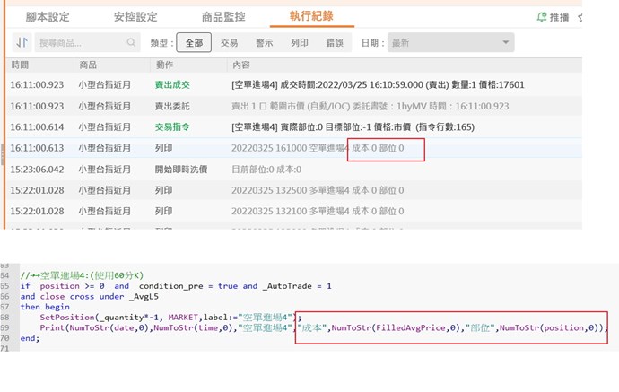 就上圖來看,您可以看到 16:11:00.613 時列印,腳本運算時觸發空單進場,此時還沒有下單。