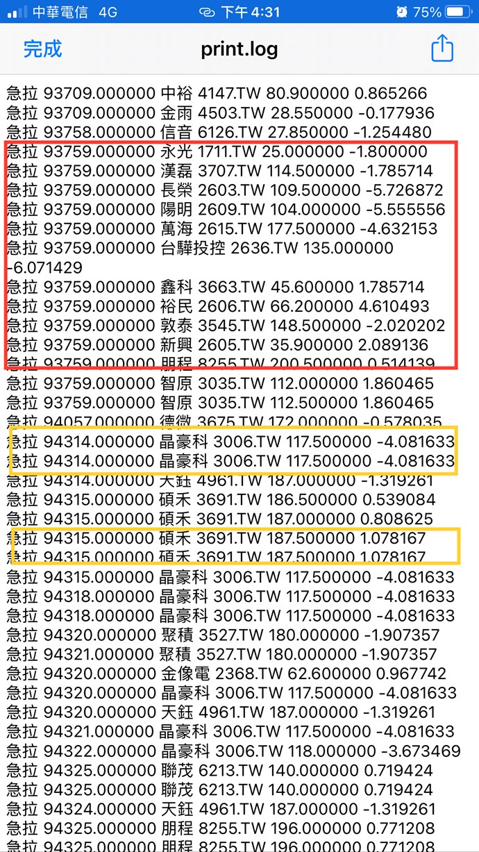 Print(file("c:\print\print.log"), "急拉",currenttime,symbolname,symbol,close,GetQuote("PriceChangeRatio"));