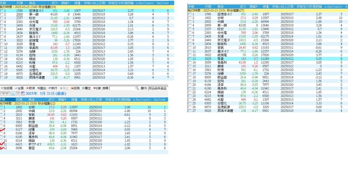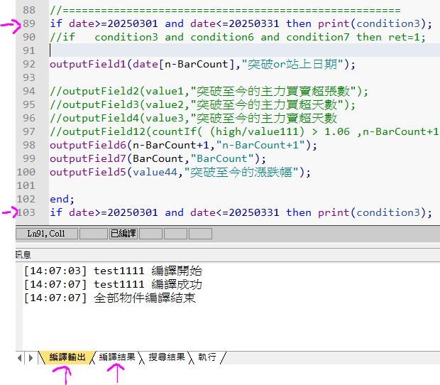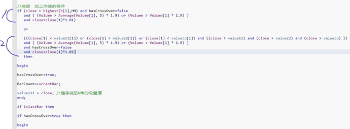 input: HH(8,"N天前突破"); input: n(10,"Search天數"); input: v0(50,"量超過均量趴數"); input: percent(4,"漲幅上限"); input:avg_3_line(0); //均線糾結開關 //距離n%以內 input:main_force(0); //主力買超次數開關 input:today_include(1); //包含金日達成條件也抓 var: hasCrossOver(false); settotalBar(n); var: BarCount(0); //===================================================== Value11 = average(close, 5); Value22 = average(close, 10); Value33 = average(close, 20); value55 = MaxList(Value11, Value22, Value33); //均線 取最大 value66 = MaxList2(Value11, Value22, Value33); //均線 第二大 value77 = MinList(Value11, Value22, Value33); value88 = MinList2(Value11, Value22, Value33); //===================================================== //突破 站上均線的條件 if (close > highest(h[1],HH) and hasCrossOver=false and ( (Volume > Average(Volume[1], 5) * 1.9) or (Volume > Volume[1] * 1.9) ) and close>close[1]*1.01) or (((close[1] < value11[1]) or (close[1] < value22[1]) or (close[1] < value33[1]) and ((close > value11) and (close > value22) and (close > value33) )) and ( (Volume > Average(Volume[1], 5) * 1.9) or (Volume > Volume[1] * 1.9) ) and hasCrossOver=false and close>close[1]*1.02) then begin hasCrossOver=true; BarCount=currentBar; value111 = close; //儲存突破k棒的收盤價 end; if islastBar then if hasCrossOver=true then begin // //===================================================== //達成站上均線條件後,未漲超過n%以上。 //----------------------------------------------------- value44=rateOfChange(c,n-BarCount+1); condition3=value44<percent; //condition4=countIf( (high/value111) > 1.06 ,n-BarCount+1 ) <1; //突破到現在 最高價不能 曾超過6% //似乎不能這樣使用 //===================================================== //===================================================== //希望該股 非牛皮股,設定曾經單日漲幅 //----------------------------------------------------- condition7= countif(close/close[1] > 1.039, 90) > 0; //過去三個月 曾經單日漲幅4%以上 //===================================================== If today_include >0 then Begin condition6 = true; End Else Begin condition6 = BarCount <n; //剛突破不抓 ,若突破根search日同一天,BarCount會=n End; condition6 = BarCount <n; //剛突破不抓 ,若突破根search日同一天,BarCount會=n //===================================================== if condition3 and condition6 and condition7 then ret=1; outputField1(date[n-BarCount],"突破or站上日期"); //outputField2(value1,"突破至今的主力買賣超張數"); //outputField3(value2,"突破至今的主力買超天數"); //outputField4(value3,"突破至今的主力賣超天數 //outputField12(countIf( (high/value111) > 1.06 ,n-BarCount+1 ),"最高價,超過突破收盤價6%次數"); outputField6(n-BarCount+1,"n-BarCount+1"); outputField7(BarCount,"BarCount"); outputField5(value44,"突破至今的漲跌幅"); end;