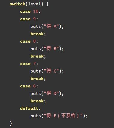 如下C++語言的範例,例如分數是9或10得A(PS:範例不用 大於小於)