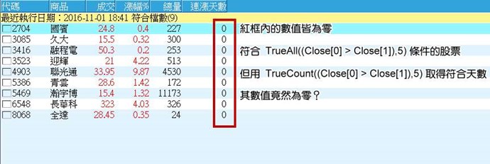 但我用 Value1 = TrueCount(Close[0] > Close[1],10); 來取得符合天數時