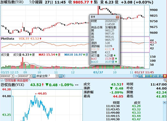 目前在副圖指標的VIX恐慌指數,僅支援到主商品為期選商品,頻率為日頻率,且沒有即時更新