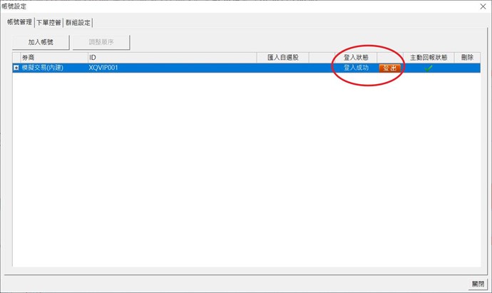 另外請協助確認您的交易帳號(XQ模擬帳號或是券商帳號)是否有在登入狀態(在XQ功能表的【交易→帳號設定】,並請試在XQ各頁面切換看看,下單列是否會正常顯示。
